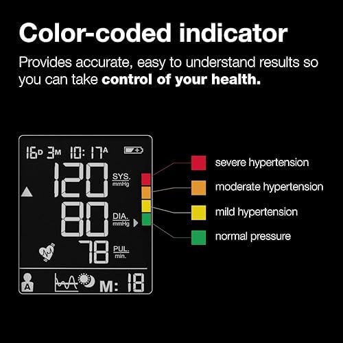 EASY TO READ COLOR CODED GUIDANCE – This blood pressure monitor with an XL backlit display provides easy to read and understand color coded guidance, based on the American Heart Association hypertension guidelines.