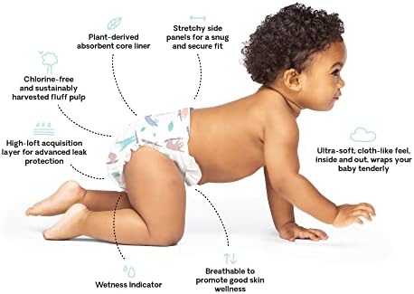 Say goodbye to leaks and blowouts. Our cutting-edge core contains a specially designed absorbent material that can absorb over 50x its weight in fluid. Plus, the inner and outer layers are super soft with a snug fit for supreme comfort. Our specially designed core with spherical absorbers allow us to reduce waste (less material) while maintaining performance (more absorbency). This technology promotes dryness, locking wetness away in bubbles of leakage protection. Our eco-friendly and hypoallergenic diapers are made with sustainably harvested fluff pulp. Breathable to promote good skin wellness Wetness indicator (N-2) Say goodbye to: lotion, fragrance, phthalates Specially designed absorbent material can absorb over 50x its weight in fluid Ultra-soft, cloth-like feel, inside and out, wraps your baby tenderly Stretchy side panels for freedom of movement High-loft acquisition layer for advanced leak protection Stays snug when soiled, reducing sag and keeping a secure and comfy fit Plant-derived absorbent core liner 100% Chlorine-Free processing