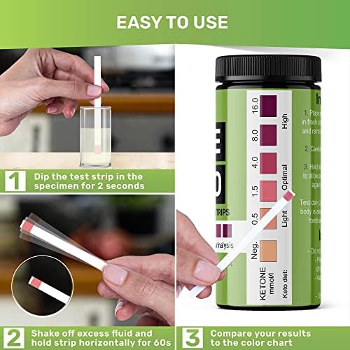 ✅QUICK & EASY: Our ketosis urine test strips are very easy to use, following 3 simple steps for instant results! Place the keto urine testing strips in the specimen, shake off excess fluid, and compare your results to the color chart