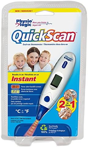 Scanning Thermometers by Physio Logic provide clinically proven accuracy for temperature readings you can trust. The Insta-Therm Quick-Scan Thermometer by Physio Logic uses infrared technology and provides probe-free readings from the ear or forehead in less than 1 second. This digital thermometer has a color-coded screen light that alerts you of a fever (orange), or lets you know that the reading is normal (green). With One-Button operation and a Easy-To-Read 3 Digit LCD, results are displayed in Fahrenheit or Celsius at the touch of a finger. The Insta-Therm Quick-Scan Thermometer conveniently stores your last 10 readings, requires no probe covers and compact design makes temperature readings easier for the whole family. Model # 016-670.