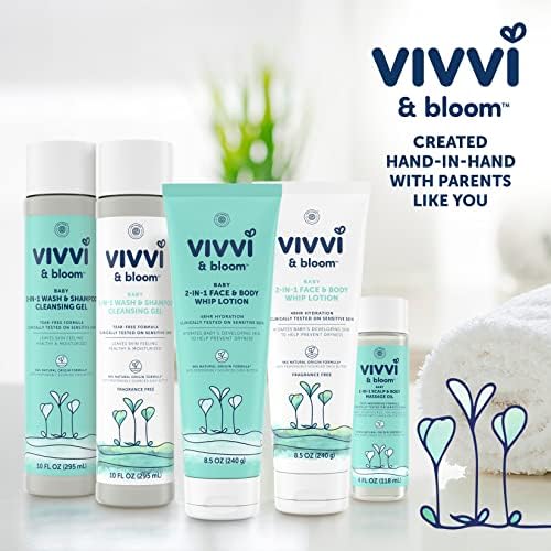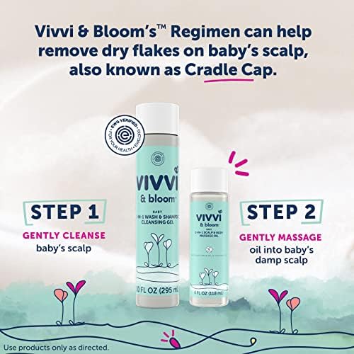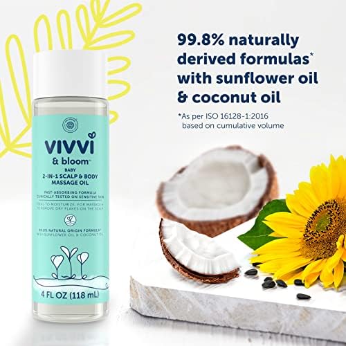 Help moisturize baby’s dry, delicate skin & scalp with Vivvi & Bloom 2-in-1 Baby Scalp & Body Massage Oil. Clinically tested on sensitive skin, this baby body oil with a naturally derived scent** helps to remove dry flakes on the scalp. With its 99.8% natural origin formula,* including coconut & sunflower oils, the oil has a gentle, non-toxic formula that absorbs quickly to leave skin & scalp feeling soft & moisturized. The body oil helps improve the look & feel of skin & 98% of parents agree that it leaves baby’s skin feeling soft & smooth. Pediatrician- & dermatologist-tested baby oil is hypoallergenic, vegan & not tested on animals & formulated without parabens, phthalates, phenoxyethanol, dyes, gluten, silicones & essential oils. To help remove scalp flakes, massage the oil into scalp to soften, wait a few minutes, gently comb baby’s hair & then wash with shampoo. *As per ISO 16128-1:2016 based on cumulative volume including water. **Naturally derived ingredients as per ISO 16128-1:2016.