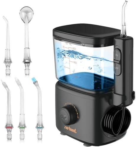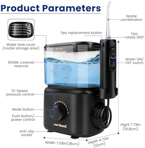 Zerhunt countertop dental water flosser / oral irrigator / WaterPik for your teeth dentists recommend daily use of a water flosser to own healthier teeth and gums,reduce the risk of gum disease.The Zerhunt dental oral irrigator use unique combination of water pressure and pulsations flushes out bacteria from deep pockets along the gum line where regular flossing can’t reach. Deep cleaning for your teeth – ultra strong pulsation design with high pressure water pulse 1250-1700 times per minutes and interchangable nozzle rotates 360 degree for cleaning all areas of your oral.Water Flossing for about a minute a day conveniently removes up to 99.9% Of plaque from treated areas and gently massages the gums to improve overall oral health. 7 multifunctional tips for family use classic tip*3 360 degree fully clean deep oral,clean the area toothbrush can not easily reach. Tongue cleaner tip*1 clean coating and bacterias effectively for fresher oral breath periodontal tip *1 massage gums,relieve periodontitis,gingivitis,teeth shrinking,reduce the thickness of pocket orthodontic tip*1 special tip for person with false tooth,wearing orthotics,dental braces,teeth socket dental plaque tip*1 an appropriative tip with special design for implants,dental bridge,false tooth crowns specification: pressure range: 30-125psi pulsation: 1250-1700 times/min. Voltage: ac100-240v frequency: 50-60hz reservoir capacity: 600ml noise standard: less than 75 db auto shut off: 3 minutes waterproof rank: ipx6.