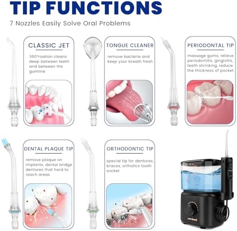 【Suitable for all oral care】- come with 7 multifunctional tips includes 3 classic jet tips, 1 periodontal tip, 1 orthodontic tip, 1 plaque seeker tip, 1 tongue cleaner tip.Can Be shared with your whole family hygienically.Water Pic is beneficial for people with braces, implants, crowns, bridges etc